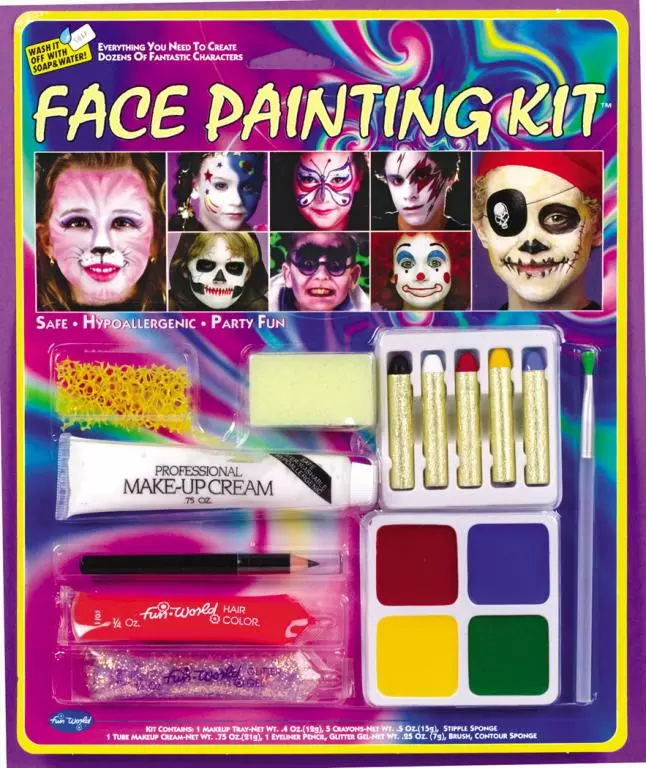 Versatile makeup pack for the whole family!Everything you need to create dozens of fantastic characters. Kit contains 4 color makeup pallet, 5 makeup crayons, 3/4 oz. tube of white foundation makeup, black makeup pencil, 1/4 oz. glitter gel, 1/4 oz. fake blood, 2 makeup sponges and makeup brush. All contained on full color blister card.