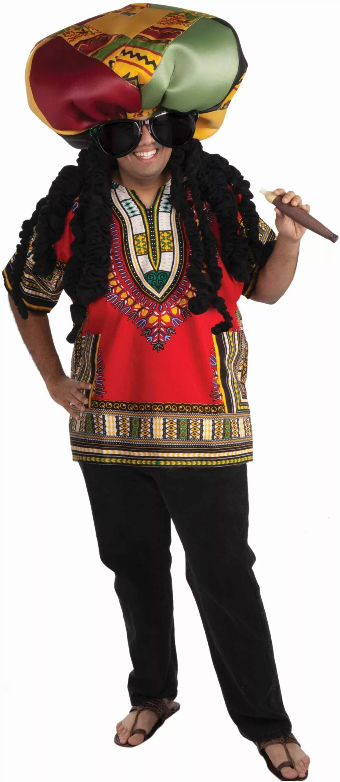 Kick back and relax with your ridiculous locks this Halloween! The Rasta Ridiculous Adult Costume includes a multi colored tunic style shirt, a pair of over sized sunglasses, and a jumbo rasta hat with attached black dreadlocks.