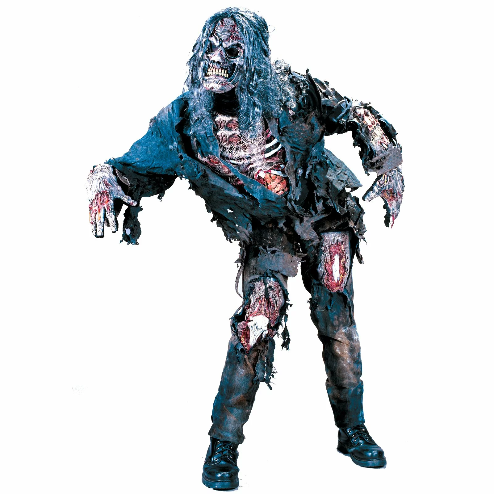 Embalm yourself in the scintillating Zombie 3-D costume. This deluxe design brings back classic Halloween horror. It includes: a plastic-molded mask with attached hair, tattered shirt with structured peek-a-boo bone/flesh chest piece, and matching pants. Gloves with coordinating gore are also included in this vacuous villain’s ensemble.